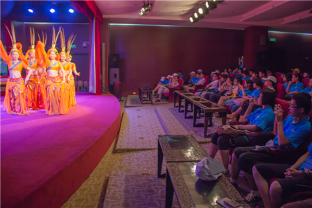 营员还欣赏了博物馆的艺术家们带来的古编钟演奏表演。演播大厅里弥漫着浓郁的楚文化风情,舞台上乐手们身着古装,手持乐锤,用钟磬等乐器为大家演奏了《楚调》、《二十八绣图》和《友谊地久天长天》等乐曲。