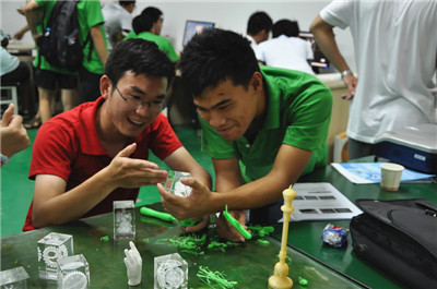 与此同时,华中科技大学分营澳门的营员们在隔壁正在聚精会神地听着学长讲解激光内雕的内容,参观激光内雕的作品。“这个东西真的非常神奇,令人惊讶。”连带队老师都发出了赞叹。随后,营员们有秩序地拍摄了3D照片,“心情非常激动,很期待着自己的水晶球”,麦诗敏同学道出了大多数营员的心声。“志愿者能否也做一个呢?”看着一个个内有自己头像的水晶球出炉,志愿者们也都十分羡慕。