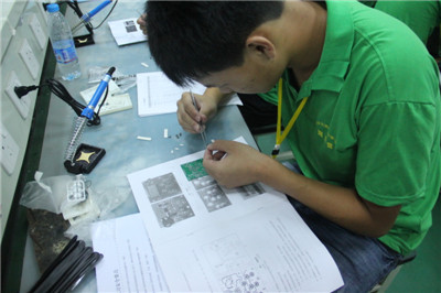 在工程训练中心二楼,安徽的营员们则正在认真地听老师讲解收音机的制作过程,时而沉思,时而低头看看自己手头上的PCB板。随后,营员们在志愿者的帮助下开始自己动手制作。“作为一个理科生,我对这个非常感兴趣,觉得非常神奇。”来自安徽阜阳市第五中学的张全帅兴奋地展示了自己的劳动成果,并且自豪地告诉我们他已经完成了早上的实验安排,正在做的是下午的实验。