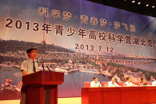 校党委副书记信思金在开营仪式上发表热情洋溢的欢迎辞。他向全体营员表示诚挚的欢迎,向全体老师及志愿者致以亲切的问候。他鼓励大家在科学营期间走近科学知识,感受科学魅力,提高科学素养,用科学的精神探索问题,用科学的思想分析问题,用科学的方法解决问题。来自黄冈中学的张今同学代表营员进行发言。他对学校无微不至的关怀表达了感激,对此次绚丽多彩的科学营探索之旅表示期待。他在发言中憧憬到:“我希望能够通过亲身体验,提高对科学探索的兴趣,激励自己学好科学本领,将来实现自己的一份中国梦。”